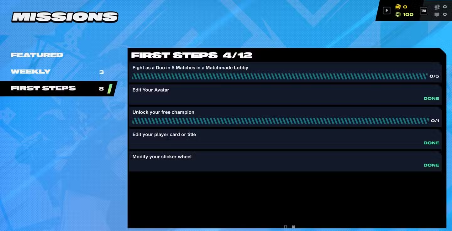 | Complete “First Steps” missions | 1 | Intro missions designed for new players |