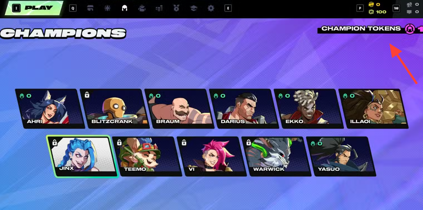 Champion Tokens appear as small pink icons inside the Champions tab. Spending one token on a champion’s bundle grants the character plus a small set of extras (a chroma and a taunt). You unlock from the Champions tab: select a character and use the on‑screen Unlock button.