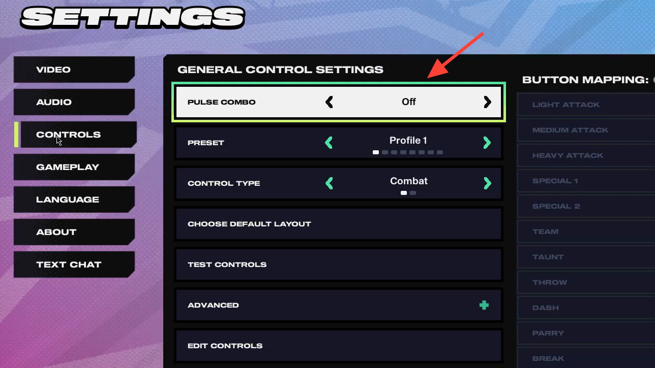 | Lobby → Settings → Controls. | Highlight Pulse Combo and tap left/right to toggle On/Off. | Applies immediately to your play profile. | No additional confirmation. |