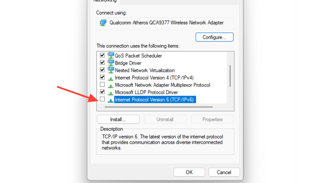 - Uncheck Internet Protocol Version 6 (TCP/IPv6) and click OK.
