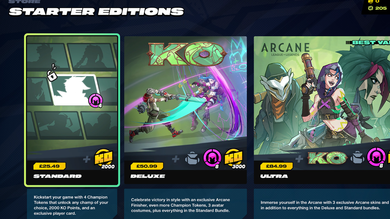 | Starter (Ultra) | $99.99 | 3 Arcane skins (Vi, Jinx, Ekko) with all Arcane chromas, Arcane sticker set, 5,000 KO Points, 8 Champion Tokens, plus everything in Deluxe and Standard |