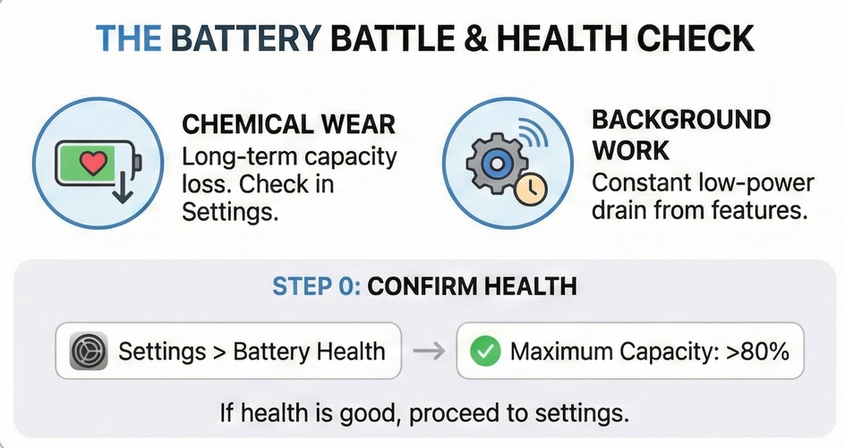Your iPhone battery is fighting two battles at once. One is chemical wear, which shows up in the Battery Health menu. The other is constant background work from features you rarely think about. If your battery health is still above roughly 80% yet you struggle to reach the end of the day, the second problem is usually the culprit.