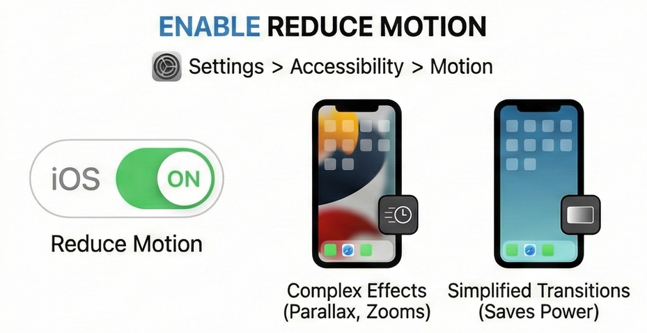 | Motion effects (Reduce Motion off) | Animate app launches, parallax wallpaper and other interface transitions | Continuously renders complex animations and sensor-driven effects with the GPU | Lower graphics workload, slightly cooler device, smoother battery curve through the day |