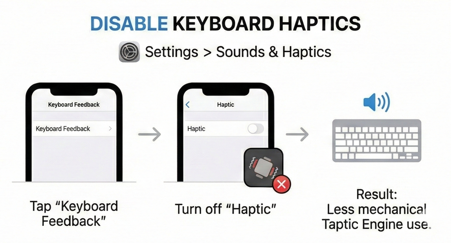 | Keyboard haptic feedback | Vibrates subtly on every key press while typing | Fires the Taptic Engine hundreds or thousands of times a day | Less constant vibration load, noticeable savings if you type a lot |