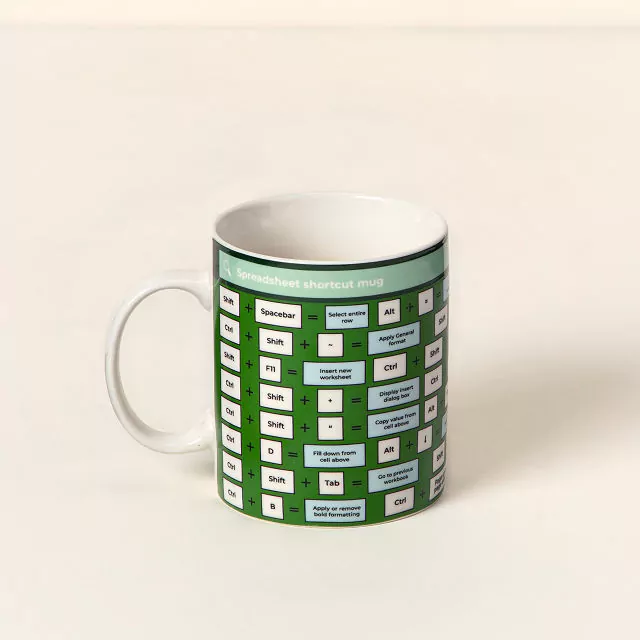 This porcelain Excel Shortcut mug consists of a ‘Spreadsheet Shortcut Mug’ search bar and a series of vital keyboard shortcuts useful in formatting, filtering, and functions. You may also come across some formulae in there as well! The mug is both dishwasher and microwave friendly and can hold up to 12 liquid ounces.