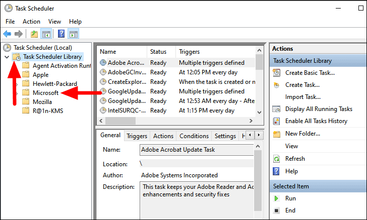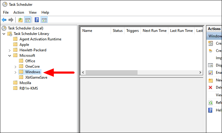 - In the Task Scheduler window, navigate to Task Scheduler Library > Microsoft > Windows.