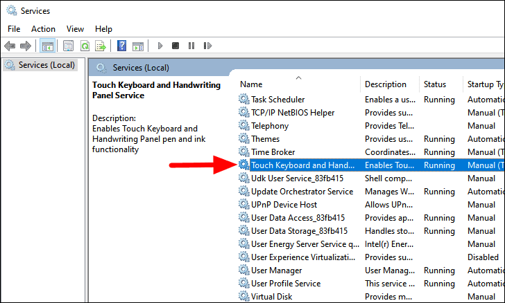- In the Services window, scroll down to find Touch Keyboard and Handwriting Panel Service. Double-click on it to open its properties.