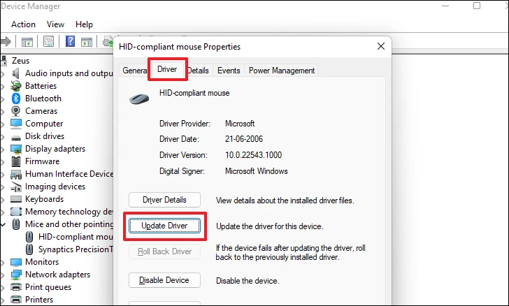 - In the Device Manager, open the properties of your mouse device as before, and go to the 'Driver' tab.