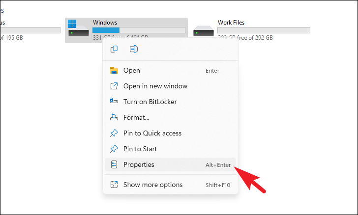Now, right-click on the Windows installer drive and choose the ‘Properties’ option from the context menu.