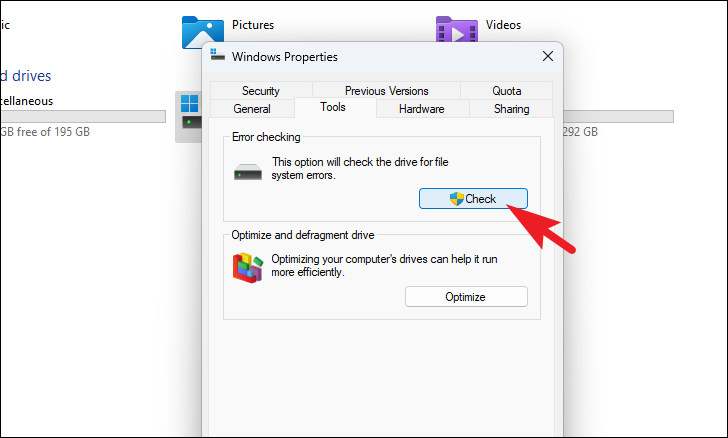 If you are not very tech-savvy, Windows gives you the option to run the CHKDSK command from the file explorer without typing any sort of commands in the Command Prompt.