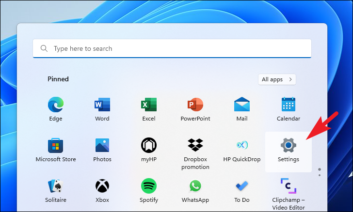 To roll back your computer to a previous state, open the Start Menu and open the Settings app by either clicking on its tile present in the ‘Pinned apps’ section or by searching for it.