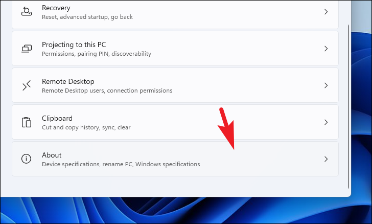 Now, from the right section of the window, scroll down to locate and click on the ‘About’ tile to continue.