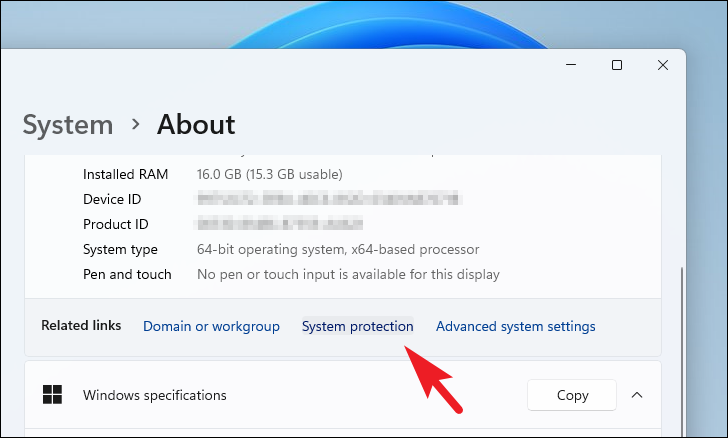 Then, on the next screen, locate and click on the ‘System protection’ option present in the ‘Related links’ section. This will open a separate window on your screen.