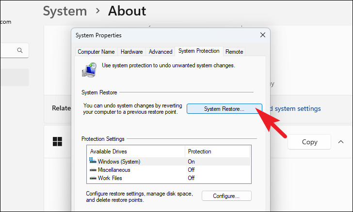 Now, from the separately opened window, locate and click on the ‘System Restore’ button. This will open a separate window on your screen.