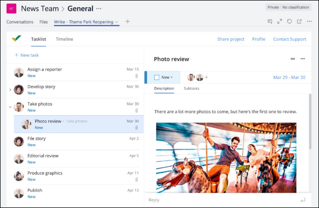 Wrike is another collaborative app available in Microsoft Teams. It might be relatively newer in the market than its predecessor on this list, but it’s packing way more power. With a lot of innovative features like Gantt Charts, drag-and-drop cards, to-do lists, custom workflow statuses, automated task assignments, and multiple projects and task views, the list for what you can do with it is almost never-ending.