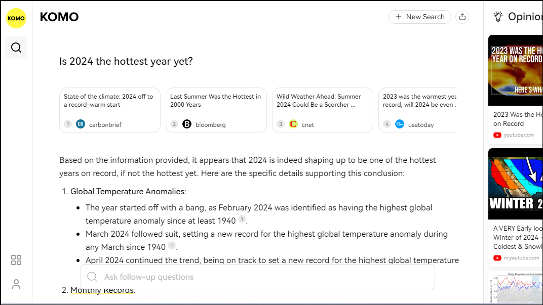 Another excellent option we recommend when it comes to AI search engines is Komo, which offers a fast, ad-free, and private searching experience. It is another AI search engine that suggests related questions based on your search and offers information related to the topic you are looking up from additional sources, which it calls 'opinions'.