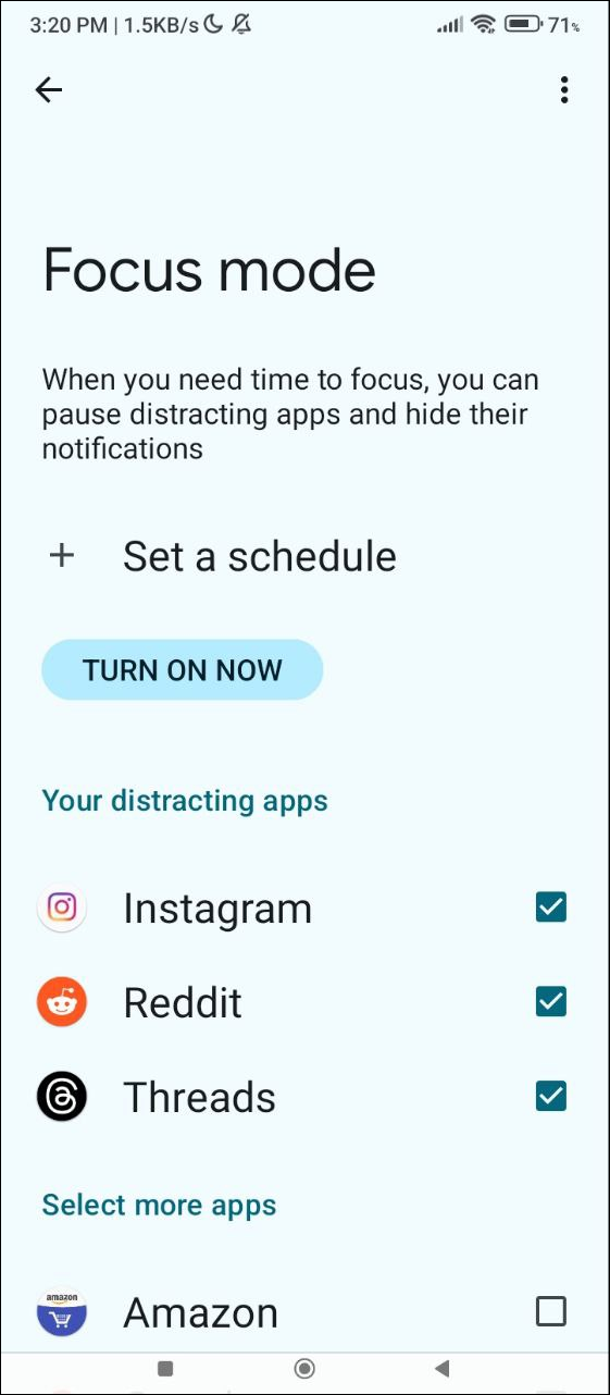 Depending on your device, you can access Focus Mode by navigating to Settings > Digital Wellbeing and Parental Controls > Focus Mode. Here, you can tap the apps you want to select and set a schedule according to which the mode will turn on and off automatically.