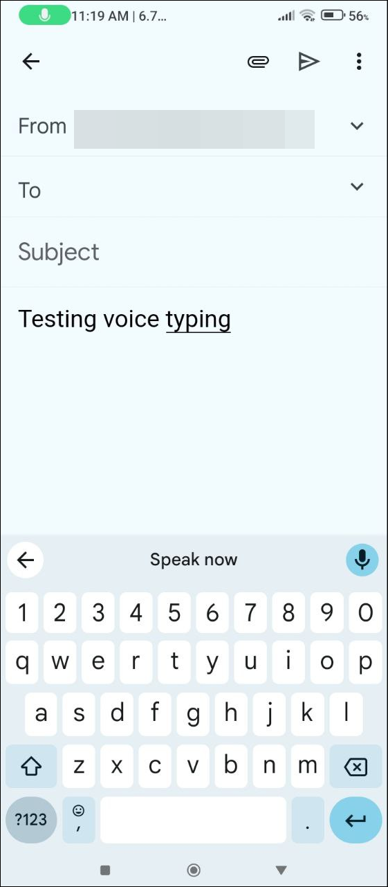 You can use voice typing in any app that lets you type, such as Gmail or Keep. Just open the app and tap in the area where you can type before tapping on the microphone icon. You can start speaking after the 'Speak Now' message appears on your screen.
