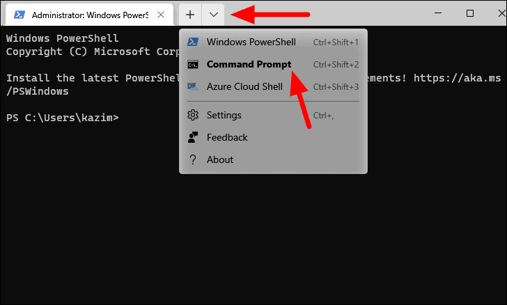 If you haven’t set ‘Command Prompt’ as the default profile, the Windows PowerShell tab will open by default when you launch Terminal. To open the Command Prompt, click on the carrot arrow icon at the top and select ‘Command Prompt’ from the menu. Alternatively, you can press CTRL + SHIFT + 2 to launch Command Prompt.