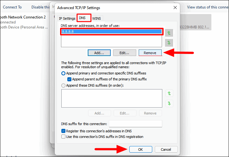 In the ‘Advanced TCP/IP Settings’, navigate to the ‘DNS’ tab, select an entry listed under ‘DNS server addresses, in order of use’ and click on ‘Remove’. Do this for all the entries here and then click on ‘OK’ at the bottom to save the changes.