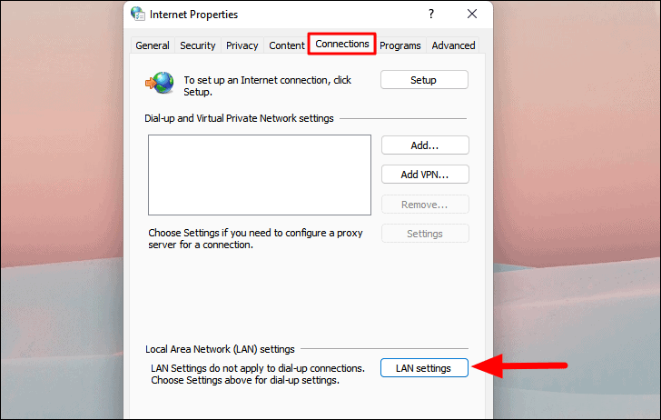 In the Internet Properties panel, navigate to the ‘Connections’ tab and click on ‘LAN settings’ at the bottom.
