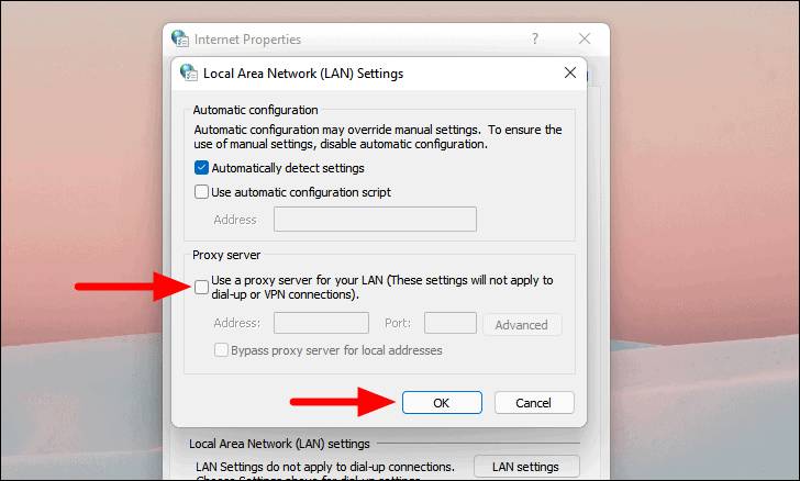 Now, untick the checkbox for ‘Use a proxy server for your LAN’ under ‘Proxy server’, and click on ‘OK’ at the bottom to save the settings.