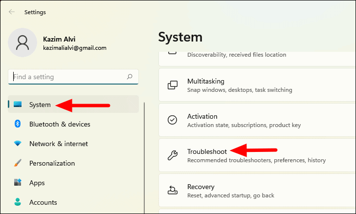 In the ‘System’ tab of Settings, click the ‘Troubleshoot’ option on the right.