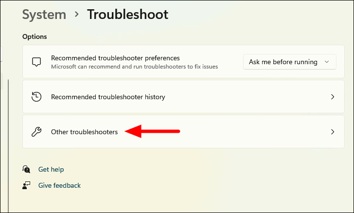 Next, click on ‘Other troubleshooters’ to view and run the various available troubleshooters.