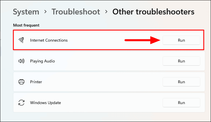 Now, locate the ‘Internet Connections’ troubleshooter, and click on the ‘Run’ option next to it.