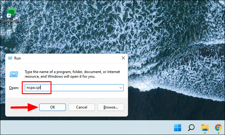 To manually change the DNS server, press WINDOWS + R to launch the ‘Run’ command, enter ‘ncpa.cpl’ in the text field, and either click on ‘OK’ at the bottom or press ENTER to launch the Network Connections panel.