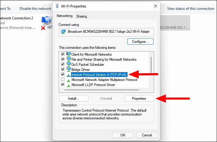 In the properties window, select the ‘Internet Protocol Version 4 (TCP/IPv4)’ and click on ‘Properties’.