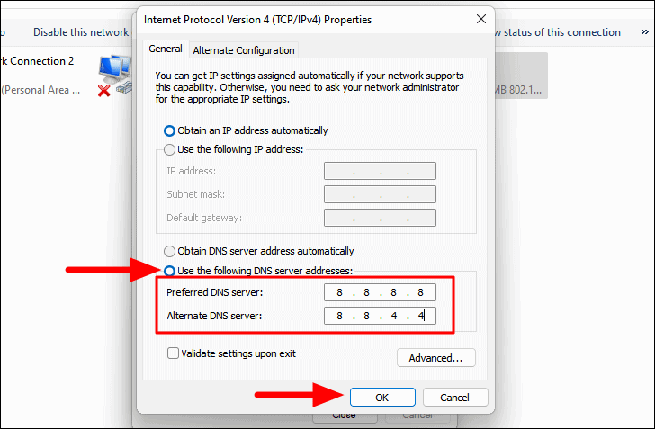 Your system obtains DNS server addresses automatically by default. If there’s an issue with your current DNS server address, you can manually switch it to Google servers. This has worked as a fix for many users.