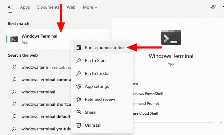 To flush the DNS, enter ‘Windows Terminal’ in the Search Bar, right-click on the relevant search result, and select ‘Run as administrator’ from the context menu.