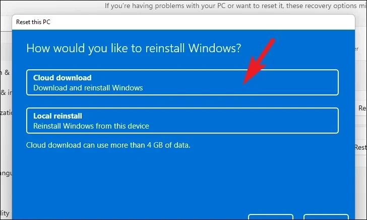 On the next screen, you will need to choose a method for reinstalling the operating system on your machine. Since there could be an issue with the copy already present on your system, we recommend that you click on the ‘Cloud download’ option.