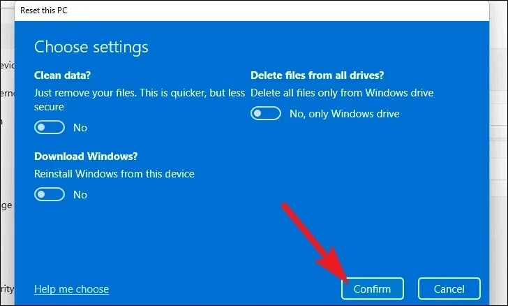 If you chose to change the settings, you can configure the following settings on the next screen. You can choose to not restore the apps and settings by clicking on the toggle switch present under the ‘Restore preinstalled apps?’ option and bringing it to the ‘No’ position. Additionally, you can switch from the Cloud download to local installation by clicking on the toggle switch present under the ‘Download Windows?’ option to change the installation method. Once adjusted according to your preference, click on the ‘Confirm’ button to proceed.