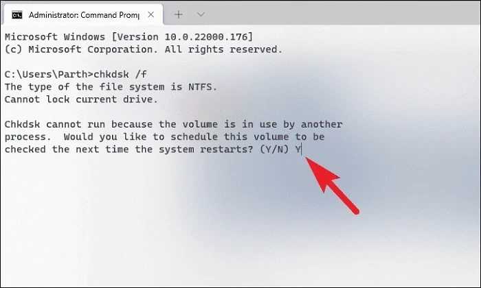 After that, press the Y key to schedule the scan to be initiated when you boot up your PC next time.