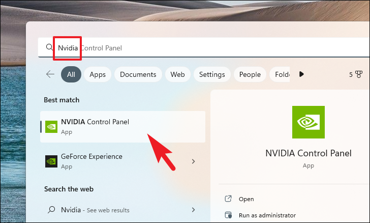 First, head to the Start Menu and type Nvidia to perform a search for it. Then, from the search results, click on the ‘NVIDIA Control Panel’ tile to proceed.