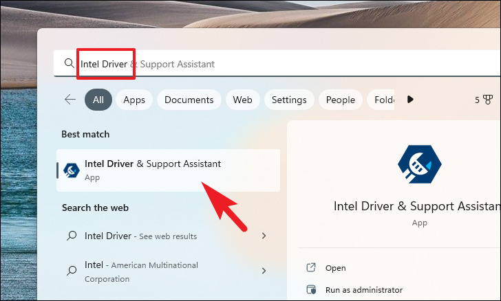 After the restart, head to the Start Menu and type Intel Driver to perform a search. Then, from the search results, click on the ‘Intel Driver & Support Assistant’ tile. This will open a webpage on your default browser.