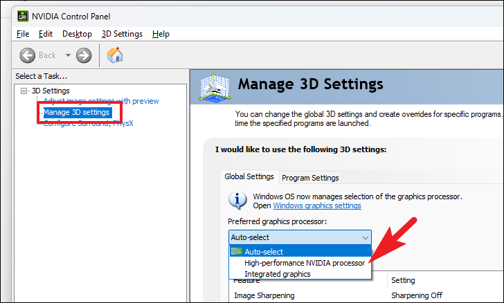Then, make sure you have selected the ‘Manage 3D settings’ option from the left sidebar. After that, make sure you have selected the ‘Nvidia processor’ from the drop-down situated under the ‘Preferred graphics processor’ field.