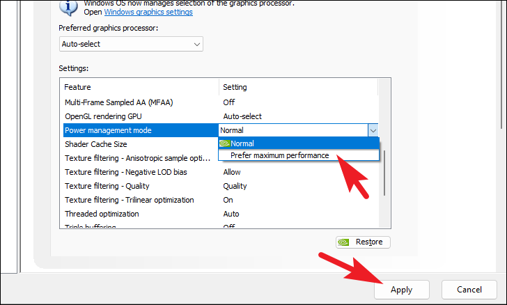 Then, search for the ‘Power management mode’ from the list below and change the setting to the ‘Prefer maximum performance’ option using the drop-down menu. Finally, click on the ‘Apply’ button to save the changes.