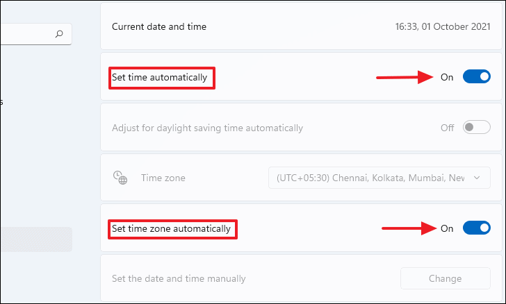 On the next screen, click the toggle adjacent to both ‘Set time automatically’ and ‘Set time zone automatically’ to set both options to ON (if it already isn’t).
