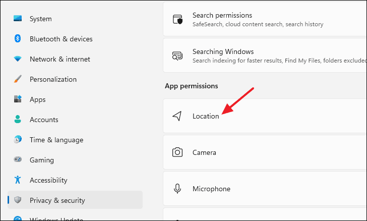 Next, scroll down a bit on the Privacy & security page and select the ‘Location’ option under the App permissions section.