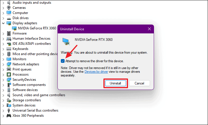 Tick the box that says ‘Attempt to remove the driver for this device’ and hit the ‘Uninstall’ button.