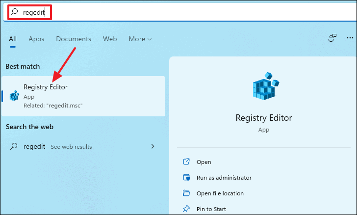 First, open the Start menu and type regedit in the search field. Then, click on the search result that says ‘Registry Editor’ to launch the app.