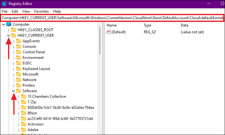 HKEY_CURRENT_USER > Software > Microsoft > Windows > CurrentVersion > CloudStore > Store > DefaultAccountCloud.
