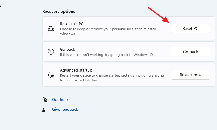 Finally, click on the ‘Reset PC’ button under Recovery options to begin the reset process.