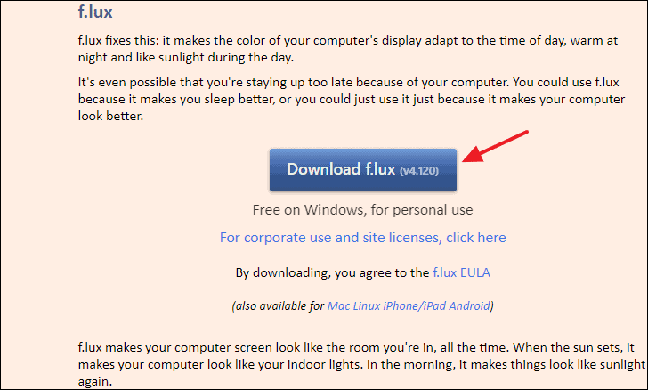 To get f.lux, first, head onto the justgetflux.com website. Then, click on ‘Download f.lux’ button on the page.