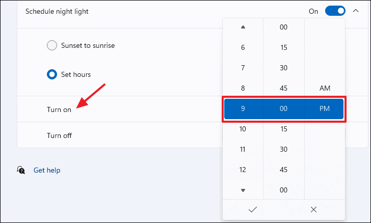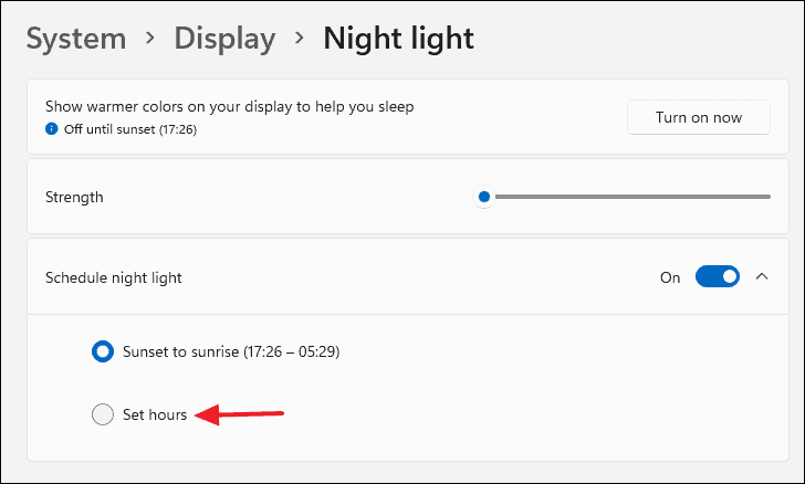 Use the ‘Turn on’ and ‘Turn off’ options under Set hours to set a time of your choice for the Night light to enable to disable automatically.