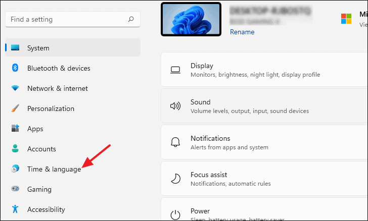 Then, click on the ‘Time & language’ option on the left side of the screen inside Windows Settings.