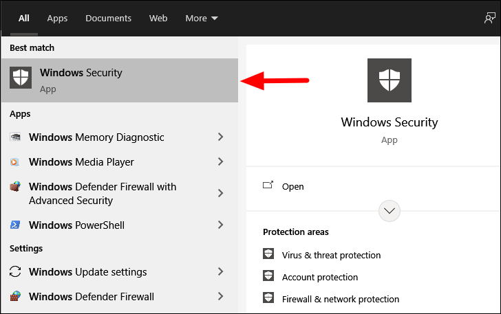 To run a ‘Full Scan’, search for ‘Windows Security’ in the ‘Start Menu’, and then click on the search result to launch the app.